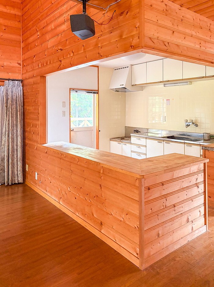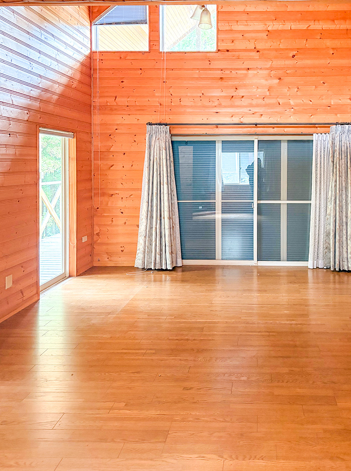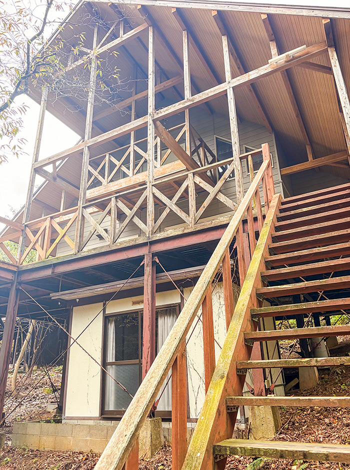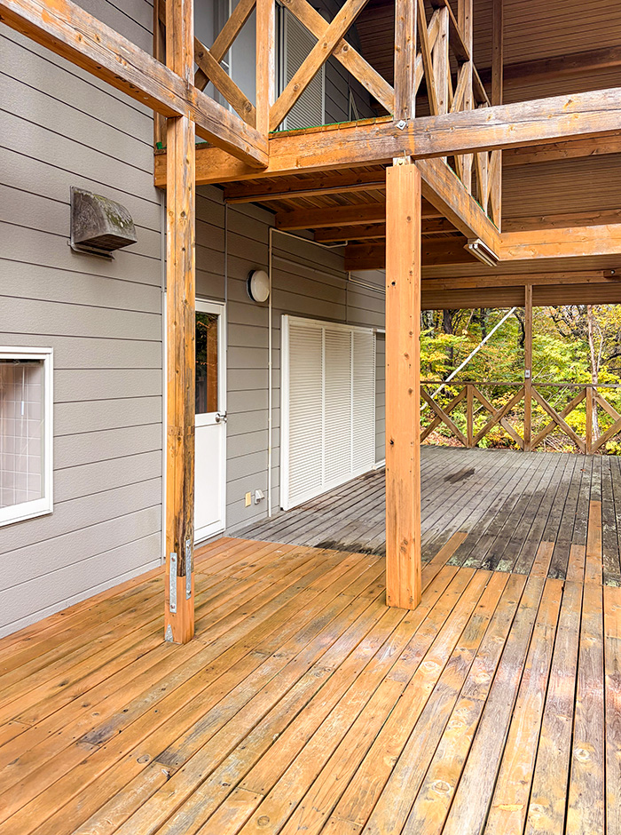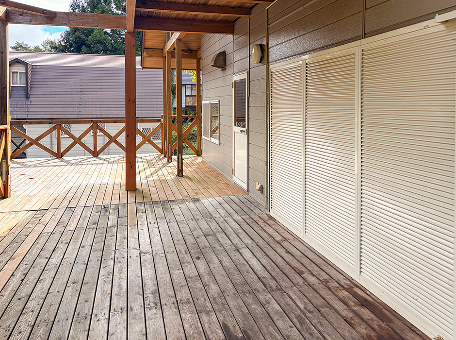 広々ウッドデッキが特徴の二階建ての中古別荘です。